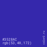 Цвет #3528AC в цветовой модели RGB обозначается тремя октетами (53, 40, 172) в десятичном формате и #3528AC в шестнадцатиричном (hex) формате, которые являются интенсивностью красного 53 (hex 35), интенсивность зелёного 40 (hex 28) и интенсивность синего 172 (hex AC).