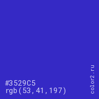 Цвет #3529C5 в цветовой модели RGB обозначается тремя октетами (53, 41, 197) в десятичном формате и #3529C5 в шестнадцатиричном (hex) формате, которые являются интенсивностью красного 53 (hex 35), интенсивность зелёного 41 (hex 29) и интенсивность синего 197 (hex C5).