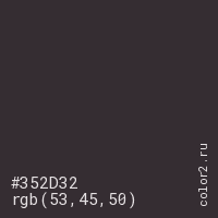 Цвет #352D32 в цветовой модели RGB обозначается тремя октетами (53, 45, 50) в десятичном формате и #352D32 в шестнадцатиричном (hex) формате, которые являются интенсивностью красного 53 (hex 35), интенсивность зелёного 45 (hex 2D) и интенсивность синего 50 (hex 32).