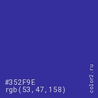 Цвет #352F9E в цветовой модели RGB обозначается тремя октетами (53, 47, 158) в десятичном формате и #352F9E в шестнадцатиричном (hex) формате, которые являются интенсивностью красного 53 (hex 35), интенсивность зелёного 47 (hex 2F) и интенсивность синего 158 (hex 9E).