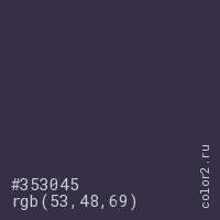 Цвет #353045 в цветовой модели RGB обозначается тремя октетами (53, 48, 69) в десятичном формате и #353045 в шестнадцатиричном (hex) формате, которые являются интенсивностью красного 53 (hex 35), интенсивность зелёного 48 (hex 30) и интенсивность синего 69 (hex 45).