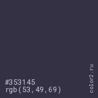 Цвет #353145 в цветовой модели RGB обозначается тремя октетами (53, 49, 69) в десятичном формате и #353145 в шестнадцатиричном (hex) формате, которые являются интенсивностью красного 53 (hex 35), интенсивность зелёного 49 (hex 31) и интенсивность синего 69 (hex 45).