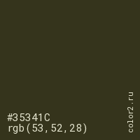 Цвет #35341C в цветовой модели RGB обозначается тремя октетами (53, 52, 28) в десятичном формате и #35341C в шестнадцатиричном (hex) формате, которые являются интенсивностью красного 53 (hex 35), интенсивность зелёного 52 (hex 34) и интенсивность синего 28 (hex 1C).