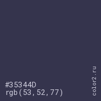 Цвет #35344D в цветовой модели RGB обозначается тремя октетами (53, 52, 77) в десятичном формате и #35344D в шестнадцатиричном (hex) формате, которые являются интенсивностью красного 53 (hex 35), интенсивность зелёного 52 (hex 34) и интенсивность синего 77 (hex 4D).