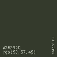 Цвет #35392D в цветовой модели RGB обозначается тремя октетами (53, 57, 45) в десятичном формате и #35392D в шестнадцатиричном (hex) формате, которые являются интенсивностью красного 53 (hex 35), интенсивность зелёного 57 (hex 39) и интенсивность синего 45 (hex 2D).