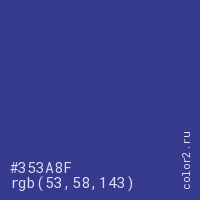 Цвет #353A8F в цветовой модели RGB обозначается тремя октетами (53, 58, 143) в десятичном формате и #353A8F в шестнадцатиричном (hex) формате, которые являются интенсивностью красного 53 (hex 35), интенсивность зелёного 58 (hex 3A) и интенсивность синего 143 (hex 8F).
