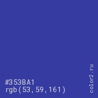 Цвет #353BA1 в цветовой модели RGB обозначается тремя октетами (53, 59, 161) в десятичном формате и #353BA1 в шестнадцатиричном (hex) формате, которые являются интенсивностью красного 53 (hex 35), интенсивность зелёного 59 (hex 3B) и интенсивность синего 161 (hex A1).