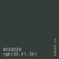 Цвет #353D38 в цветовой модели RGB обозначается тремя октетами (53, 61, 56) в десятичном формате и #353D38 в шестнадцатиричном (hex) формате, которые являются интенсивностью красного 53 (hex 35), интенсивность зелёного 61 (hex 3D) и интенсивность синего 56 (hex 38).