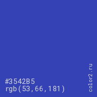 Цвет #3542B5 в цветовой модели RGB обозначается тремя октетами (53, 66, 181) в десятичном формате и #3542B5 в шестнадцатиричном (hex) формате, которые являются интенсивностью красного 53 (hex 35), интенсивность зелёного 66 (hex 42) и интенсивность синего 181 (hex B5).