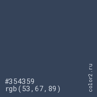 Цвет #354359 в цветовой модели RGB обозначается тремя октетами (53, 67, 89) в десятичном формате и #354359 в шестнадцатиричном (hex) формате, которые являются интенсивностью красного 53 (hex 35), интенсивность зелёного 67 (hex 43) и интенсивность синего 89 (hex 59).