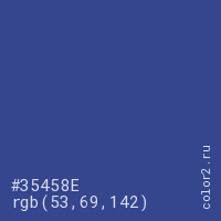 Цвет #35458E в цветовой модели RGB обозначается тремя октетами (53, 69, 142) в десятичном формате и #35458E в шестнадцатиричном (hex) формате, которые являются интенсивностью красного 53 (hex 35), интенсивность зелёного 69 (hex 45) и интенсивность синего 142 (hex 8E).