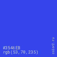 Цвет #3546EB в цветовой модели RGB обозначается тремя октетами (53, 70, 235) в десятичном формате и #3546EB в шестнадцатиричном (hex) формате, которые являются интенсивностью красного 53 (hex 35), интенсивность зелёного 70 (hex 46) и интенсивность синего 235 (hex EB).
