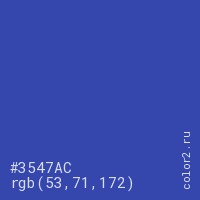 Цвет #3547AC в цветовой модели RGB обозначается тремя октетами (53, 71, 172) в десятичном формате и #3547AC в шестнадцатиричном (hex) формате, которые являются интенсивностью красного 53 (hex 35), интенсивность зелёного 71 (hex 47) и интенсивность синего 172 (hex AC).
