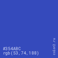 Цвет #354ABC в цветовой модели RGB обозначается тремя октетами (53, 74, 188) в десятичном формате и #354ABC в шестнадцатиричном (hex) формате, которые являются интенсивностью красного 53 (hex 35), интенсивность зелёного 74 (hex 4A) и интенсивность синего 188 (hex BC).
