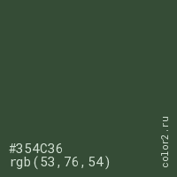 Цвет #354C36 в цветовой модели RGB обозначается тремя октетами (53, 76, 54) в десятичном формате и #354C36 в шестнадцатиричном (hex) формате, которые являются интенсивностью красного 53 (hex 35), интенсивность зелёного 76 (hex 4C) и интенсивность синего 54 (hex 36).