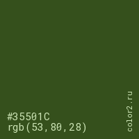 Цвет #35501C в цветовой модели RGB обозначается тремя октетами (53, 80, 28) в десятичном формате и #35501C в шестнадцатиричном (hex) формате, которые являются интенсивностью красного 53 (hex 35), интенсивность зелёного 80 (hex 50) и интенсивность синего 28 (hex 1C).