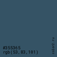 Цвет #355365 в цветовой модели RGB обозначается тремя октетами (53, 83, 101) в десятичном формате и #355365 в шестнадцатиричном (hex) формате, которые являются интенсивностью красного 53 (hex 35), интенсивность зелёного 83 (hex 53) и интенсивность синего 101 (hex 65).
