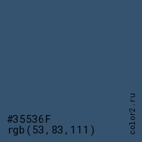 Цвет #35536F в цветовой модели RGB обозначается тремя октетами (53, 83, 111) в десятичном формате и #35536F в шестнадцатиричном (hex) формате, которые являются интенсивностью красного 53 (hex 35), интенсивность зелёного 83 (hex 53) и интенсивность синего 111 (hex 6F).