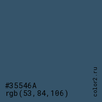 Цвет #35546A в цветовой модели RGB обозначается тремя октетами (53, 84, 106) в десятичном формате и #35546A в шестнадцатиричном (hex) формате, которые являются интенсивностью красного 53 (hex 35), интенсивность зелёного 84 (hex 54) и интенсивность синего 106 (hex 6A).