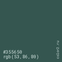 Цвет #355650 в цветовой модели RGB обозначается тремя октетами (53, 86, 80) в десятичном формате и #355650 в шестнадцатиричном (hex) формате, которые являются интенсивностью красного 53 (hex 35), интенсивность зелёного 86 (hex 56) и интенсивность синего 80 (hex 50).