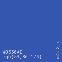 Цвет #3556AE в цветовой модели RGB обозначается тремя октетами (53, 86, 174) в десятичном формате и #3556AE в шестнадцатиричном (hex) формате, которые являются интенсивностью красного 53 (hex 35), интенсивность зелёного 86 (hex 56) и интенсивность синего 174 (hex AE).