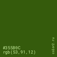 Цвет #355B0C в цветовой модели RGB обозначается тремя октетами (53, 91, 12) в десятичном формате и #355B0C в шестнадцатиричном (hex) формате, которые являются интенсивностью красного 53 (hex 35), интенсивность зелёного 91 (hex 5B) и интенсивность синего 12 (hex 0C).