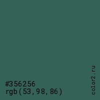 Цвет #356256 в цветовой модели RGB обозначается тремя октетами (53, 98, 86) в десятичном формате и #356256 в шестнадцатиричном (hex) формате, которые являются интенсивностью красного 53 (hex 35), интенсивность зелёного 98 (hex 62) и интенсивность синего 86 (hex 56).