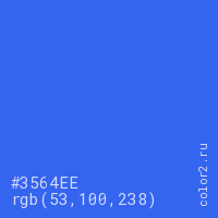 Цвет #3564EE в цветовой модели RGB обозначается тремя октетами (53, 100, 238) в десятичном формате и #3564EE в шестнадцатиричном (hex) формате, которые являются интенсивностью красного 53 (hex 35), интенсивность зелёного 100 (hex 64) и интенсивность синего 238 (hex EE).