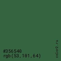 Цвет #356540 в цветовой модели RGB обозначается тремя октетами (53, 101, 64) в десятичном формате и #356540 в шестнадцатиричном (hex) формате, которые являются интенсивностью красного 53 (hex 35), интенсивность зелёного 101 (hex 65) и интенсивность синего 64 (hex 40).