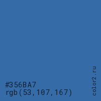 Цвет #356BA7 в цветовой модели RGB обозначается тремя октетами (53, 107, 167) в десятичном формате и #356BA7 в шестнадцатиричном (hex) формате, которые являются интенсивностью красного 53 (hex 35), интенсивность зелёного 107 (hex 6B) и интенсивность синего 167 (hex A7).