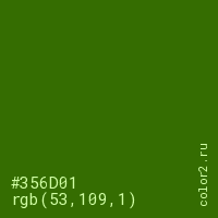 Цвет #356D01 в цветовой модели RGB обозначается тремя октетами (53, 109, 1) в десятичном формате и #356D01 в шестнадцатиричном (hex) формате, которые являются интенсивностью красного 53 (hex 35), интенсивность зелёного 109 (hex 6D) и интенсивность синего 1 (hex 01).