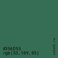Цвет #356D55 в цветовой модели RGB обозначается тремя октетами (53, 109, 85) в десятичном формате и #356D55 в шестнадцатиричном (hex) формате, которые являются интенсивностью красного 53 (hex 35), интенсивность зелёного 109 (hex 6D) и интенсивность синего 85 (hex 55).