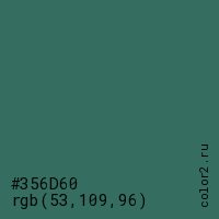 Цвет #356D60 в цветовой модели RGB обозначается тремя октетами (53, 109, 96) в десятичном формате и #356D60 в шестнадцатиричном (hex) формате, которые являются интенсивностью красного 53 (hex 35), интенсивность зелёного 109 (hex 6D) и интенсивность синего 96 (hex 60).