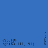 Цвет #356FBF в цветовой модели RGB обозначается тремя октетами (53, 111, 191) в десятичном формате и #356FBF в шестнадцатиричном (hex) формате, которые являются интенсивностью красного 53 (hex 35), интенсивность зелёного 111 (hex 6F) и интенсивность синего 191 (hex BF).
