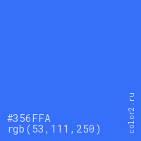 Цвет #356FFA в цветовой модели RGB обозначается тремя октетами (53, 111, 250) в десятичном формате и #356FFA в шестнадцатиричном (hex) формате, которые являются интенсивностью красного 53 (hex 35), интенсивность зелёного 111 (hex 6F) и интенсивность синего 250 (hex FA).