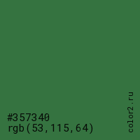 Цвет #357340 в цветовой модели RGB обозначается тремя октетами (53, 115, 64) в десятичном формате и #357340 в шестнадцатиричном (hex) формате, которые являются интенсивностью красного 53 (hex 35), интенсивность зелёного 115 (hex 73) и интенсивность синего 64 (hex 40).