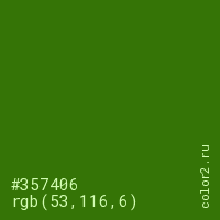 Цвет #357406 в цветовой модели RGB обозначается тремя октетами (53, 116, 6) в десятичном формате и #357406 в шестнадцатиричном (hex) формате, которые являются интенсивностью красного 53 (hex 35), интенсивность зелёного 116 (hex 74) и интенсивность синего 6 (hex 06).
