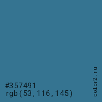 Цвет #357491 в цветовой модели RGB обозначается тремя октетами (53, 116, 145) в десятичном формате и #357491 в шестнадцатиричном (hex) формате, которые являются интенсивностью красного 53 (hex 35), интенсивность зелёного 116 (hex 74) и интенсивность синего 145 (hex 91).
