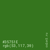 Цвет #35751E в цветовой модели RGB обозначается тремя октетами (53, 117, 30) в десятичном формате и #35751E в шестнадцатиричном (hex) формате, которые являются интенсивностью красного 53 (hex 35), интенсивность зелёного 117 (hex 75) и интенсивность синего 30 (hex 1E).