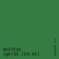 Цвет #357C42 в цветовой модели RGB обозначается тремя октетами (53, 124, 66) в десятичном формате и #357C42 в шестнадцатиричном (hex) формате, которые являются интенсивностью красного 53 (hex 35), интенсивность зелёного 124 (hex 7C) и интенсивность синего 66 (hex 42).