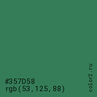 Цвет #357D58 в цветовой модели RGB обозначается тремя октетами (53, 125, 88) в десятичном формате и #357D58 в шестнадцатиричном (hex) формате, которые являются интенсивностью красного 53 (hex 35), интенсивность зелёного 125 (hex 7D) и интенсивность синего 88 (hex 58).