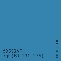Цвет #3583AF в цветовой модели RGB обозначается тремя октетами (53, 131, 175) в десятичном формате и #3583AF в шестнадцатиричном (hex) формате, которые являются интенсивностью красного 53 (hex 35), интенсивность зелёного 131 (hex 83) и интенсивность синего 175 (hex AF).