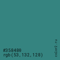 Цвет #358480 в цветовой модели RGB обозначается тремя октетами (53, 132, 128) в десятичном формате и #358480 в шестнадцатиричном (hex) формате, которые являются интенсивностью красного 53 (hex 35), интенсивность зелёного 132 (hex 84) и интенсивность синего 128 (hex 80).