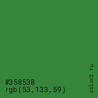 Цвет #35853B в цветовой модели RGB обозначается тремя октетами (53, 133, 59) в десятичном формате и #35853B в шестнадцатиричном (hex) формате, которые являются интенсивностью красного 53 (hex 35), интенсивность зелёного 133 (hex 85) и интенсивность синего 59 (hex 3B).