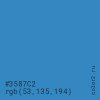 Цвет #3587C2 в цветовой модели RGB обозначается тремя октетами (53, 135, 194) в десятичном формате и #3587C2 в шестнадцатиричном (hex) формате, которые являются интенсивностью красного 53 (hex 35), интенсивность зелёного 135 (hex 87) и интенсивность синего 194 (hex C2).