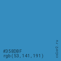 Цвет #358DBF в цветовой модели RGB обозначается тремя октетами (53, 141, 191) в десятичном формате и #358DBF в шестнадцатиричном (hex) формате, которые являются интенсивностью красного 53 (hex 35), интенсивность зелёного 141 (hex 8D) и интенсивность синего 191 (hex BF).
