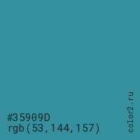 Цвет #35909D в цветовой модели RGB обозначается тремя октетами (53, 144, 157) в десятичном формате и #35909D в шестнадцатиричном (hex) формате, которые являются интенсивностью красного 53 (hex 35), интенсивность зелёного 144 (hex 90) и интенсивность синего 157 (hex 9D).