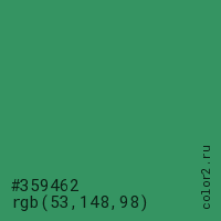 Цвет #359462 в цветовой модели RGB обозначается тремя октетами (53, 148, 98) в десятичном формате и #359462 в шестнадцатиричном (hex) формате, которые являются интенсивностью красного 53 (hex 35), интенсивность зелёного 148 (hex 94) и интенсивность синего 98 (hex 62).