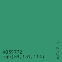 Цвет #359772 в цветовой модели RGB обозначается тремя октетами (53, 151, 114) в десятичном формате и #359772 в шестнадцатиричном (hex) формате, которые являются интенсивностью красного 53 (hex 35), интенсивность зелёного 151 (hex 97) и интенсивность синего 114 (hex 72).