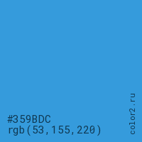 Цвет #359BDC в цветовой модели RGB обозначается тремя октетами (53, 155, 220) в десятичном формате и #359BDC в шестнадцатиричном (hex) формате, которые являются интенсивностью красного 53 (hex 35), интенсивность зелёного 155 (hex 9B) и интенсивность синего 220 (hex DC).